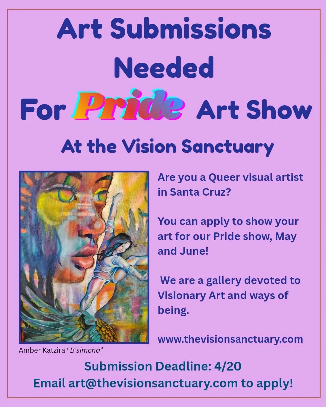 Calls to Artists Show your art in staged homes on the real estate market!! Want to show your art at the Neighbors Pub? (Downtown Santa Cruz) Apply Here! Submit Art for our PRIDE show! Deadline to apply: April 20 Semi-Private Art studio residency Become a Member! - access to local vending opportunities, discounts on art classes and more. Want to teach a class or host an event here? Please Fill out this form Subscribe Sign up with your email address to receive news and updates. First Name Last Name Email Address Sign Up We respect your privacy. Thank you! Please add art@thevisionsanctuary.com to your contacts to avoid our emails ending up in your spam inbox!