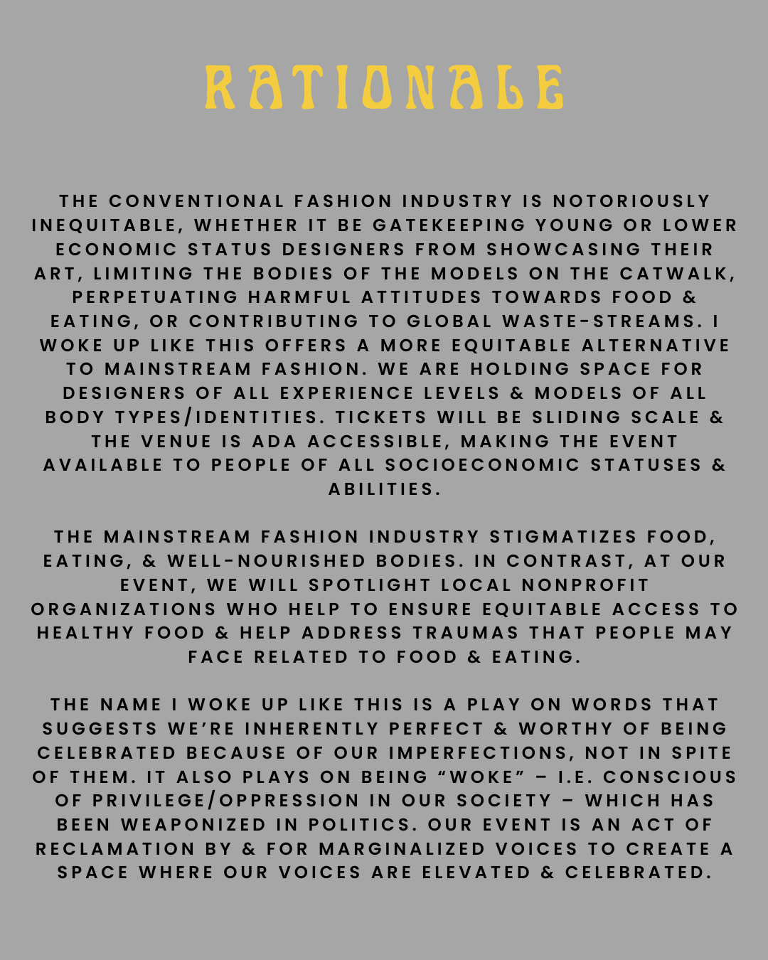“Eye Woke Up Like This”Food + Fashion Extravaganza October 11, 2-6pm@ Woodhouse Brewery, Santa Cruz Acquire Tickets Below: Eye Woke Up Like This - Food + Fashion Extravaganza from $15.00 Participate: Call to Models Apply to Vend / Live Paint/ Table for Community Orgs